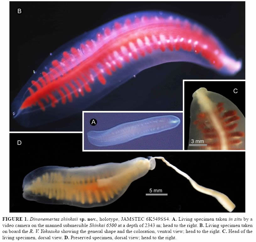 Kajihara, H., and D. J. Lindsay, (2010), Dinonemertes shinkaii sp. nov., (Nemertea: Hoplonemertea: Polystilifera: Pelagica) a new species of bathypelagic nemertean: Zootaxa, v. 2429, p. 43–51.